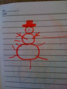 Take a look at this picture that Thing 3 drew over the winter. There is a hat, carrot nose, eyes, and mouth. All stuff you would expect to see. Then there are the arms and a bunch of legs. Except the line at the bottom is not a leg.